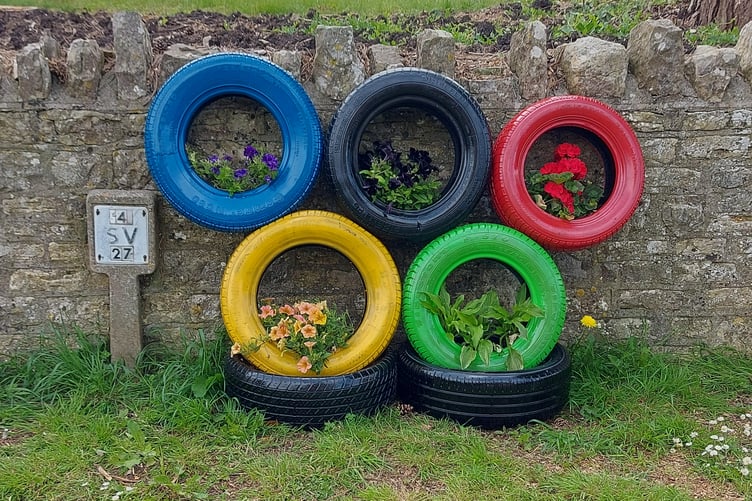 They have constructed a podium, with the rings in place and have set up bronze, silver and gold planters. The set up is built at Hill Court and villagers have been encouraged to go and have their photos taken. There is also a structure of five tyres, donated by Central Garage, all painted in the olympic colours and can be seen on the corner of Alexandra Park and High Street in Paulton.