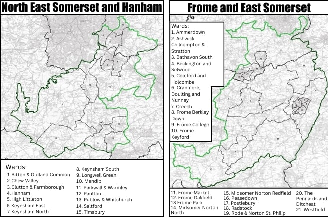 The Frome and East Somerset constituency, which in addition to a Somerset Council area also includes Midsomer Norton, Radstock, Westfield, Peasedown St John and the parishes in Bathavon South (Camerton, Claverton, Combe Hay, Dunkerton, Tunley, Englishcombe, Freshford, Hinton Charterhouse, Marksbury, Monkton Combe, Priston, Shoscombe, South Stoke and Wellow), is administered by Somerset Council.