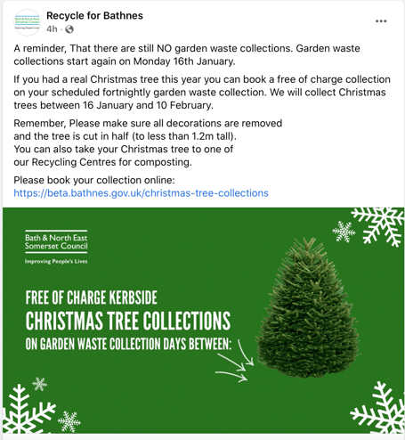 If you would like the council to collect your tree, you need to register your tree online at https://beta.bathnes.gov.uk/christmas-tree-collections by 9pm the day before your scheduled garden waste collection. The booking system can be accessed now, and collections will start from 16th January. More information will be given on the exact date of your collection upon booking.
