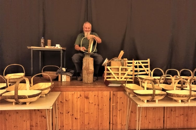 He can put together six trugs in an hour but preparing the wood takes many hours before the assembly process. He uses a throw, an axe, and a draw knife. He smooths them off and rubs in linseed oil to finish. He also makes traditional hurdles in a range of sizes.