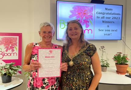 The Large Garden Gold award was presented to Amanda Cranston by Dine Romero, Mayor of Bath. Amanda’s idyllic and diverse rural acre garden is set in the peaceful countryside, outside of Radstock. Amanda carries out all the gardening herself so is the worthy winner of this coveted prize.