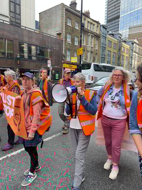 She joined a mums’ march on Shaftesbury Avenue with 23 others from the West Country, which resulted in the arrests of three women – two from Bristol and one from Bradford-on-Avon. During the march, which ended up in Hamleys toy store, the women held signs with slogans including “I am a mother, I won’t look away” and “give our kids hope”.