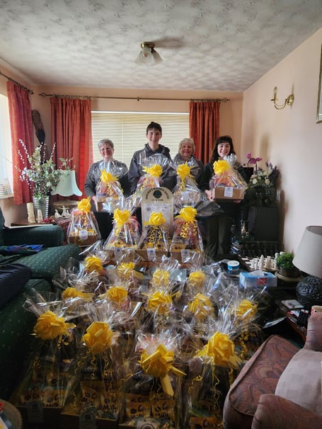 Lion Margaret Burdon and new Lion Lyn Haile set to work on making up Easter egg hampers. Margaret’s daughter and grandchildren got involved helping to make them up as it took many hands to get them looking perfect. The Club feel that we are not over egging it to say that they have achieved the wow factor.