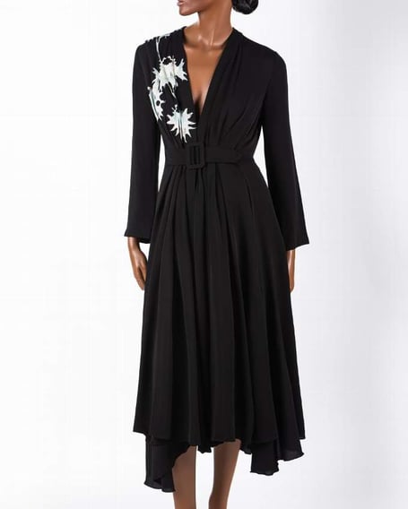 One of the defining pop-cultural moments of 2021, the highly anticipated two-hour television interview aired in nearly 70 countries and drew an estimated 60 million viewers worldwide. The Duchess wore a long, black triple silk georgette dress with deep front, lotus flower embroidery and matching belt from Giorgio Armani’s Spring/Summer 2022 Cruise Collection, which is still available to buy in America.