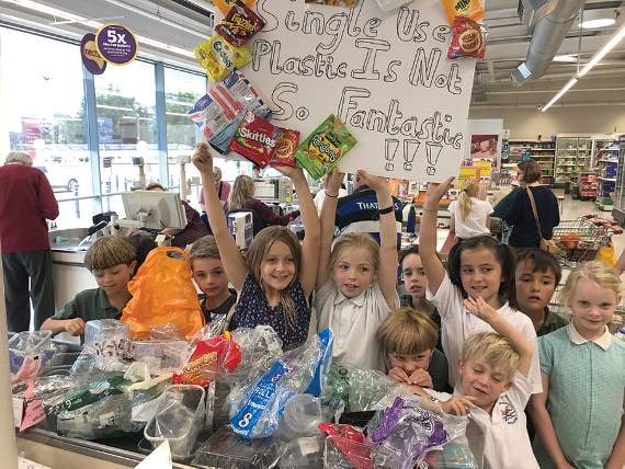 Teachers at St Julian’s School had made single-use plastic packaging the subject of the school’s arts week, where children learned about the enormity of the plastics crisis and what we can all do to help end it. Using less plastic packaging was placed at the top of their agenda.