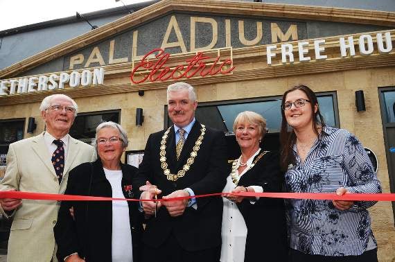 Cutting the ribbon, at the opening of The Palladium Electric, was Ken and Shirley Steel (former owners of the Palladium Cinema), the Mayor of Midsomer Norton, Paul Myers, The Chairman of B&NES Council, Karen Walker, and the Manageress of the new Wetherspoon, Rhi Buttrey.